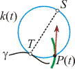 Mutassuk meg, hogy a pályagörbe P(t0) pontjában a pályagörbe érintőegyenese átmegy a k(t) kör azon S pontján, amely a körön átellenes a k(t) kör és a γ görbe érintési pontjával!
