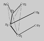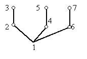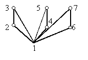 Ha az 1-es pontot választjuk gyökérnek, akkor a szélességi faváz egy csillag lesz, s ez nyilván nem felel meg, hiszen a kimaradó élek mindegyike azonos szintű, tehát nem összehasonlítható pontok között fut. Nézzük, mi lehet jó. Nyilvánvaló, hogy például a 2-es és 3-as pont közül egyik az első emeletre, közvetlenül a gyökér fölé fog kerülni, feltehetjük, hogy a 2-es kerül az első emeletre. De akkor a 3-as pontnak a második emeletre kell kerülnie, különben az első emeletre kerülne, s akkor a 23 él nem előd és utód között futna. Hasonlóan a 4-es és 5-ös pont közül is az egyik az első emeletre kerül, a másik a másodikra, és a 6-os és 7-es pontra is ugyanez áll. A faváz most így néz ki: