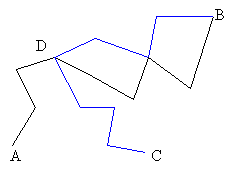 A második állítás bizonyítására bemutatunk egy másik bizonyítást is, amely egyrészt nagyon hasonlít az előző bizonyításra, másrészt nagyon hasonló a 3. feladat bizonyításához is. Induljunk el az A-ból B-be vezető úton és menjünk addig, amíg az első olyan ponthoz nem érünk, amely rajta van a B-t C-vel összekötő úton is. (Legkésőbb a B pont ilyen lesz.) Ebből a pontból folytassuk az utunkat a B-bol C-be vezető úton C-ig. Útközben biztosan nem találkozunk már érintett ponttal, hiszen D volt az első közös pont. Így kaptunk egy A-t C-vel összekötő utat.
