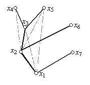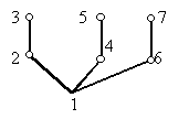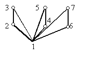 Ha az 1-es pontot választjűk gyökérnek, akkor a szélességi faváz egy csillag lesz, s ez nyilván nem felel meg, hiszen a kimaradó élek mindegyike azonos szintű, tehát nem összehasonlítható pontok között fut. Nézzük, mi lehet jó. Nyilvánvaló, hogy például a 2-es és 3-as pont közül egyik az első emeletre, közvetlenül a gyökér fölé fog kerülni, feltehetjük, hogy a 2-es kerül az első emeletre. De akkor a 3-as pontnak a második emeletre kell kerülnie, különben az első emeletre kerülne, s akkor a 23 él nem előd és utód között futna. Hasonlóan a 4-es és 5-ös pont közül is az egyik az első emeletre kerül, a másik a másodikra, és a 6-os és 7-es pontra is ugyanez áll. A faváz most így néz ki: