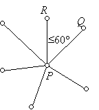 31.          a) Ha egy P pontból menne hat él különböző pontokhoz, akkor volna ezek között kettő, Q és R, amelyekre QPRÐ ≤ 60° volna. Így QR nem lehet a háromszög legnagyobb oldala. A szimmetria miatt feltehetjük, hogy PQ a háromszög legnagyobb oldala, s ekkor PQ nem lehetne behúzva a távolsággráfban (mind P-hez van Q-nál közelebbi pont: R, mind Q-hoz van P-nél közelebbi pont: R).