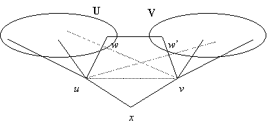 Ezután térjünk vissza oda, hogy a faváz második emeletén van legalább három másodfokú pont, legyen ezek egyike wU. Az aláhúzott állítás szerint w másik szomszédja nem lehet U-ban, de nem lehet v és x sem, vagyis w másik szomszédja V-ben van, jelöljük ezt w’-vel. Ahhoz, hogy w-ből el lehessen jutni kettő hosszú úttal V minden pontjába, w’-nek össze kell kötve lennie V minden pontjával, hiszen w másik szomszédja, u egyikkel sincs összekötve.