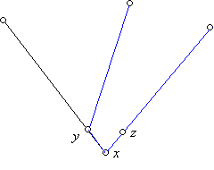 A f) részhez hasonlóan most is induljunk ki egy minimális fokú pontból, legyen ez x és legyen x fokszáma k. Most is tudjuk, hogy k≥2. Másrészt ha minden pont fokszáma legalább négy, akkor a gráfnak legalább 2n éle van, tehát nincs mit bizonyítanunk. Ezek szerint k=2 vagy 3. Tekintsünk egy x gyökerű szélességi favázat. Legyen először k=3.