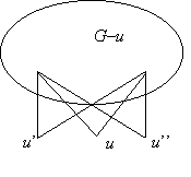 g) A c) részben talált 2+3 pontú teljes páros gráf mintájára könnyen találunk olyan 2-átmérőjű, telített pont nélküli gráfot, amelynek n pontja és 2n–4 éle van: ilyen a 2+(n–2) pontú teljes páros gráf, azaz az a páros gráf, amelynek egyik osztályában két pont van, a másikban n–2 pont és a különböző osztályba tartozó pontok között minden él be van húzva. De kérdés, hogy nincs-e ennél kevesebb élű is? A c) részben láttuk, hogy n=4-re nincs, de n=5-re van: az ötszög. A 2+n–2 pontú teljes gráf megkapható úgy is, hogy veszünk egy kettő hosszú xuy utat – ez 2 átmérőjű gráf! –, és középső pontját, u-t „megsokszorozzuk”, azaz felveszünk még n–3 pontot és azt is összekötjük az út két végpontjával, x-szel és y-nal. Általában is igaz, hogy ha egy 2-átmérőjű gráfban van egy u másodfokú pont, akkor azt ily módon megsokszorozhatjuk, vagyis: ha felveszünk további pontokat, amelyeket összekötünk u két szomszédjával, akkor ismét 2-átmérőjű gráfot kapunk. Hiszen ha u-ból bármely pontba el lehetett jutni legfeljebb kettő hosszú úttal, akkor az újonnan felvett pontokból is el lehet jutni bármely régi pontba. Másrészt bármely két új pont között is van kettő hosszú út.